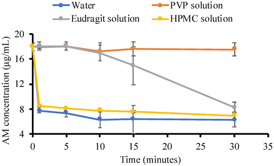 The nucleation induction time was evaluated at the beginning of measurement (1, 5, 10, 15, and 30 min), as shown in Figure 6, to confirm the ability of each polymer to inhibit AM crystal nucleation. In the phosphate buffer, the AM concentration rapidly decreased after 1 min, indicating that AM has a high crystallization tendency in the solution. AM also crystallized rapidly in the HPMC solution after 1 min. Furthermore, a high concentration of AM was maintained for 15 min in the eudragit solution but rapidly decreased due to rapid crystallization. This suggested that eudragit can inhibit the AM crystal nucleation, although it has a weak ability. Based on these induction times, it is apparent that the rate of nucleation of AM from PVP solutions was slower compared to HPMC and eudragit due to the strong ability of PVP in the inhibition of AM crystal nucleation.