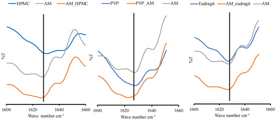 Solution FT-IR spectra in water are not easy to obtain as water absorbs strongly throughout most of the IR region. Therefore, the FT-IR spectrum of pure water was subtracted from the FT-IR spectrum of each sample. This was carried out to obtain the FT-IR spectra in an aqueous solution, as shown in Figure 7. The spectra of the carbonyl group of AM and PVP measured in an aqueous solution were observed at around 1627.63 cm−1 and 1628.59 cm−1, respectively. The carbonyl group spectra of AM in AM-PVP solution were shifted to around 1623.77 cm−1. This is due to the possible intermolecular interaction between the carbonyl group of AM as an acceptor of hydrogen with PVP as a donor of hydrogen. However, the carbonyl group spectra of eudragit and AM-eudragit were found at around 1627.63 cm−1 and 1626.66 cm−1, respectively. This shows the possible weak intermolecular interaction or no interaction between AM and eudragit. The carbonyl group of AM in the HPMC solution was observed at around 1626.66 cm−1. These results suggested that the interaction between AM and HPMC was not detected compared to the nucleation time measurement. The slight shift observed in AM-HPMC can be due to the formation of a homogenous mixture between AM and HPMC. Although the shift in spectra in the AM-PVP solution was observed, the spectra were not clear enough because the concentration of all samples was very low. Therefore, further investigation of AM-PVP is still needed to clarify the effect of the interaction of AM-PVP on the supersaturated solution of AM.