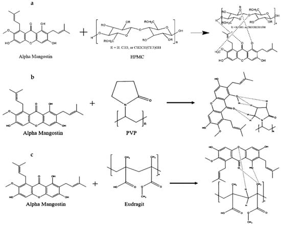 Although the crystallization inhibition of drugs in the aqueous supersaturated solutions by polymeric additives has been extensively investigated [13,14,15], the mechanism of crystallization inhibition for each drug is different because of the individual’s specific physicochemical properties [11]. The maintenance of a high degree of drug supersaturation by polymeric additives depends on their ability to inhibit nucleation and crystal growth. In this study, the inhibition mechanism of drug crystal nucleation by different polymers based on a molecular-level characterization in the supersaturated solution was evaluated. Alpha-mangostin (AM) was used as a model of the poorly water-soluble drug because it is an active compound sourced from herbal plants, which has poor aqueous solubility and low oral bioavailability [16]. Meanwhile, hypromellose (HPMC) [17,18], polyvinylpyrrolidone (PVP) [19,20], and eudragit were used as polymers due to their ability to inhibit drug crystallization in the supersaturated solutions based on previous reports [10]. The crystallization inhibition of AM was also investigated using water-soluble chitosan as a polymer in pure water, as reported in our previous study [21]. This is because water-soluble chitosan was not soluble in the buffer/biorelevant dissolution media. The inhibition mechanism of the crystal nucleation of AM by the polymer in the supersaturated solutions using biorelevant dissolution media has not been studied. There is also no report on the use of HPMC, PVP, and eudragit to inhibit the crystallization of AM, as well as the relationship between AM-polymer interactions and their molecular mobility with crystallization inhibition of AM in the supersaturated system. Therefore, an investigation of the ability of each polymer to inhibit the crystallization of AM in supersaturated solutions using biorelevant dissolution media is necessary to develop the formulation of AM as poorly water-soluble drugs, specifically for oral drug formulation.