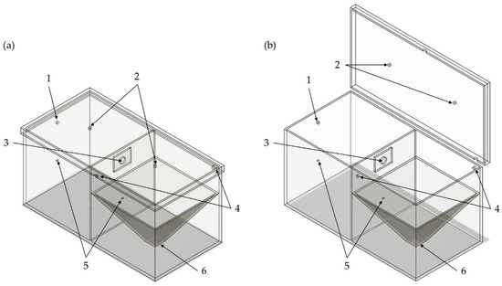 In Figure 1, a simplified illustration of the novel two-chamber setup (TCS) is shown. The setup consists of an emission chamber and a detection chamber, connected by an orifice with a diameter of 25.4 mm. A flap that is controllable via a double acting pneumatic cylinder is installed to separate the chambers, depending on the phase of the measurement course. The emission chamber shows dimensions of 300 mm × 300 mm × 300 mm, resulting in a volume of 27 L. The detection chamber has the same dimensions, but exhibits a smaller volume of approximately 15 L because of the pyramidal construction in the lower section of the chamber.