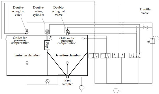 In Figure 3, the pneumatic valves and devices are shown. The pneumatic ball valve (KH 14 P, Pneumatikatlas, Lübeck, Germany), located above the emission chamber, was used for the atomization of ACAM. Another identical pneumatic ball valve, positioned behind a throttle valve, is located above the detection chamber to generate a flow in the direction of the emission chamber. Both ball valves are controlled pneumatically by 5/2 solenoid valves (VUVS-L25-M52-AD-G14-F8, Festo, Esslingen, Germany). Two 3/2 solenoid valves (VUVS-LK25-M32C-14-B, Festo, Esslingen, Germany) were used to control 3/2 pneumatic valves (SFP4701, YPC, Jeongwang-Dong, South Korea) that manage the pressure compensations. All four solenoid valves are linked to the four outputs of the PLC. All pneumatic components and orifices for pressure compensation are attached to compressed-air tubes (PUN-10X, Festo, Esslingen, Germany). The air sampling pump is connected to the IOM sampler at the bottom of the detection chamber. A digital paddle wheel flow meter (35812, ANALYT-MTC Meßtechnik, Mülheim, Germany) was used to verify the flow rate of the air sampling pump. Additionally, the pressure and temperature difference between the emission and the detection chamber were measured by a differential pressure gauge (testo 400, Testo, Titisee Neustadt, Germany).