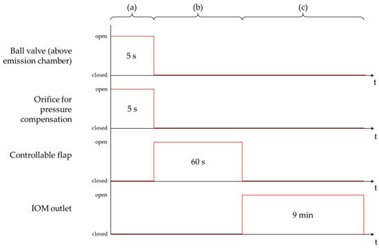 The third phase was defined as the detection phase of the measurement course, during which the dust emission of ACAM within the detection chamber was determined. The controllable flap was closed after 60 s to separate both chambers and to quantify the amount of ACAM transferred from the emission to the detection chamber. The detection chamber was evacuated using the air sampling pump, with a flow rate of 5.0 L/min for 9 min. The pump was connected to the IOM sampler located at the bottom of the detection chamber, which contained a glass microfiber filter (1820–025, Whatman, Little Chalfont, UK), as recommended by the ISPE [6]. In Figure 4, the three phases of the measurement course are shown schematically.