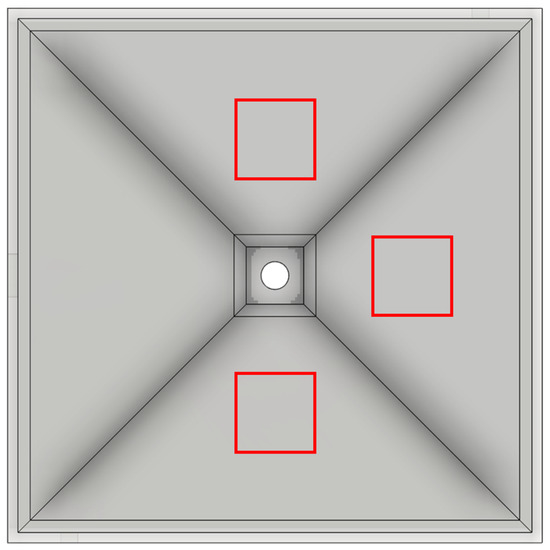 Detection chamber (top view) and the positions of the three square fields (highlighted in red) for the measurement of the mean gray value.