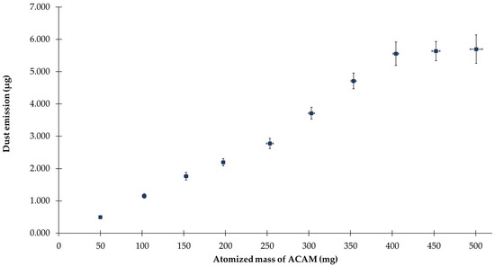 Dust emission versus the atomized mass of ACAM (means ± SD, n = 6).