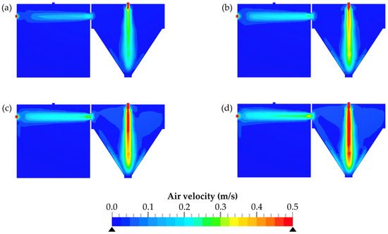Resulting air velocities depending on the pressure difference between the emission and the detection chamber. Δp values: 1 Pa (a); 2 Pa (b); 3 Pa (c); 4 Pa (d).
