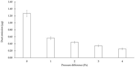 Dust emissions from the plain diffusive transport of ACAM (0 Pa) and from that of ACAM with the oppositely directed convective flow (means ± SD, n = 3). For information on the simulated and measured average air velocity, refer to Table 3.