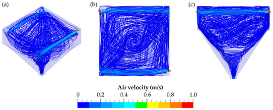 A particle trace analysis was also performed with CFD, and the results are displayed in Figure 9. The negative pressure generated by the air sampling pump was compensated for by incoming air flowing through the diagonally arranged orifices (Figure 9a,b). Initially, the air flows were parallel to the walls of the detection chamber. Because of the diagonal arrangement of the orifices and the impingement of the airflow onto the walls opposite to the orifices, a rotation of the airflow occurred. The rotating airflow also shifted downwards within the detection chamber towards the IOM sampler attached to the bottom of the chamber (Figure 9c). The highest velocity of the airflow was measured directly at the orifices. After the incoming air passed the orifices, the velocity of the airflow within the chamber decreased.