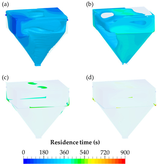 The residence time of the airborne particles within the detection chamber within different time periods is presented in Figure 10. The zones of the airborne particles, with a residence time between 540 and 900 s, are illustrated in Figure 10d. Compared to Figure 10a–c, which comprised three time periods of 180 s each up to the time point of 540 s, these zones are relatively small. These zones are located exclusively on the walls at the upper part of the detection chamber.