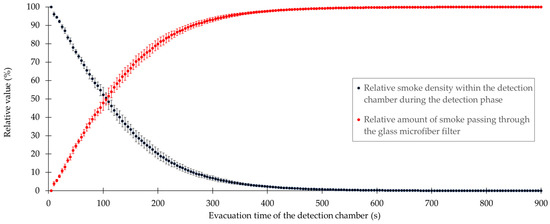 Relative values of the smoke density and the amount of removed smoke versus the evacuation time of the detection chamber.
