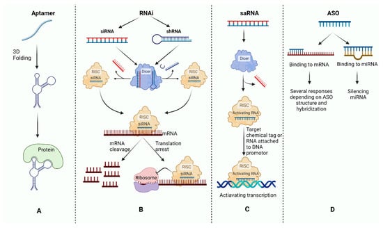 (A) Aptamers consist of 3D-folded single-stranded oligonucleotides with the ability to bind to proteins and peptides. They can inhibit the function of target proteins and peptides. (B) RNA interference (RNAi) oligonucleotides are double-stranded RNAs and include small interfering RNAs (siRNAs) and small hairpin RNAs (shRNAs). Dicer enzyme cleaves double-stranded RNAi, and antisense (guide) strands degrade target mRNAs or arrest translational processes via an RNA-induced silencing complex (RISC). RISC is a multiprotein complex that alternates gene expression. The miRNAs or siRNAs are loaded on an RISC and attach to their complementary mRNA transcripts. An RISC-associated protein or Argonaute is then activated and inhibits protein synthesis by cleaving mRNA or arresting translational process. The siRNAs transport to cell cytoplasm and are associated with Dicer/RISC, but shRNAs initially transport to cell nuclei using a vector for transcription. The product will then export to cell cytoplasm and will be associated with Dicer/RISC. (C) Small activating RNAs (saRNAs) are double-stranded RNAs activating gene expression via an RISC. The saRNAs are loaded on RISC and bind to chemical tags or RNA copies attached to DNA that prevent promoter activation. Argonaute is then activated and increases gene expression by removing these chemical tags and RNA copies. (D) Antisense oligonucleotides (ASOs) modify gene expression by binding to mRNA or noncoding RNA (miRNA). “Schematic diagram created with premade icons and templates from biorender.com (accessed on 20 August 2022)”.