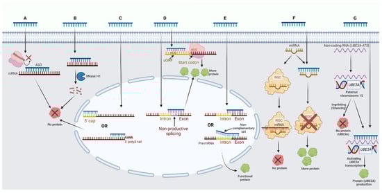 Antisense oligonucleotides (ASOs) can bind to mRNA and reduce the levels of toxic protein by (A) translational arrest due to the steric hindrance of ribosomal subunit binding, (B) inducing the RNase H1 endonuclease activity that cleaves RNA-DNA hybrids on mRNA, or (C) destabilizing pre-mRNA by inhibiting 5′ cap formation/modulating 3′ polyadenylation. (D) ASOs are able to increase gene expression by targeting upstream open reading frames within the 5′ untranslated region or nonproductive alternative splicing. (E) ASOs can modify mRNA splicing by targeting splicing enhancers/splicing silencers or inducing splicing enhancer by including a noncomplementary tail and alternate nonfunctional protein to improve function. (F) ASOs can target miRNAs and inhibit their RISC-dependent action to reduce protein translation. (G) Other noncoding RNAs can be the target of ASOs. ASOs targeting a noncoding transcript (UBE3A-ATS) were shown to activate paternal UBE3A gene expression in Angelman syndrome. “Schematic diagram created with premade icons and templates from biorender.com (accessed on 20 August 2022)”.