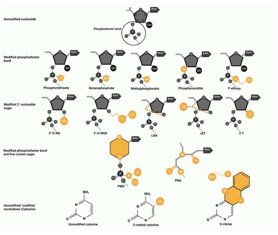 Antisense oligonucleotide modifications include modified phosphodiester bond (e.g., phosphorothioate, boranophosphate, methylphosphonate, phosphoramidite, and p-ethoxy), modified 2′ nucleotide sugar (e.g., 2′-O-methyl (2′-O-Me), 2′-O-methoxyethyl (2′-O-MOE), locked nucleic acid (LNA), constrained ethyl (cEt), and 2′-fluoro (2′ F)), modified phosphodiester bond and five-carbon sugar (e.g., phosphorodiamidate morpholino oligomer (PMO) and peptide nucleic acid (PNA)) and modified nucleobase (e.g., 5-methyl cytosine and G-clamp). “Schematic diagram created with premade icons and templates from biorender.com (accessed on 20 August 2022)”.