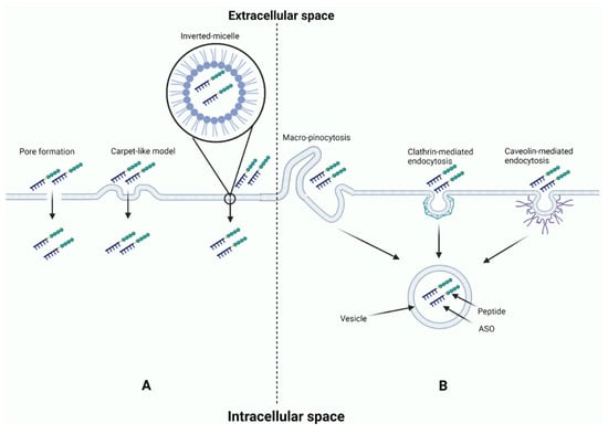 Cell-penetrating peptides (CPPs) have fewer than 30 amino acids and were first discovered in 1988 through examination of the function of short arginine-rich peptide encoded by HIV-1 or Tat peptide to carry proteins and cross cell membranes to deliver cargo to cytosol [118,119]. CPPs facilitate the transport of different cargo molecules that are not able to cross cell membranes, including oligonucleotides and proteins. The underlying mechanisms of CPP internalization are not completely understood; however, several studies suggest that CPPs enter cells by directly penetrating the cell membrane or by endocytosis [120,121,122,123,124]. Cell membrane penetration is known as membrane transduction and can be achieved by the interaction of the negatively charged phospholipid layer with the positively charged CPPs that destabilize cell membranes or form transient structures including pores and inverted micelles [123,124] (Figure 5A). Endocytic internalization can be directed toward macropinocytosis, clathrin-mediated, caveolin-mediated, or clathrin/caveolin-independent pathways [125,126,127,128]. The subsequent release of peptides and ASO cargo from vesicles is the main limiting factor that determines the effectiveness of drug delivery after endocytosis (Figure 5B). An ongoing clinical trial is assessing the safety and efficacy of peptide-conjugated eteplirsen (vesleteplirsen) in patients with DMD (NCT04004065).