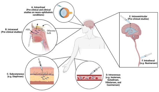 Systemic administration of ASOs via the IV route has been commonly used in patients with neuromuscular diseases, including DMD. The subcutaneous injection of ASOs has been used in polyneuropathy caused by hereditary transthyretin amyloidosis and myotonic dystrophy. ATL1102 in RRMS and DMD has also been administered via SC injection [164,166]. Intravitreal (IVT) injection is another route for ASO administration in neuro-ophthalmologic conditions, including retinitis pigmentosa due to Usher syndrome and Leber congenital amaurosis type 10.