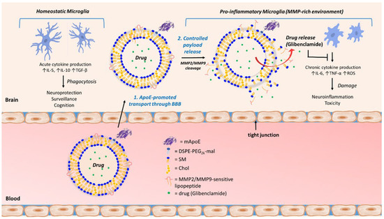 We built dual-functional liposomes to deliver poorly bioavailable drugs across the BBB, and to release them in response to up-regulated MMPs in neuroinflammatory microenvironments. Such profile is due to (i) the co-assembly of lipids with MMP-responsive peptide-fatty acid chimeras (MSLP molecules), yielding nano-sized liposomes able to release their payload in response to increased MMP2 and MMP9 levels; and to (ii) the surface functionalization of such liposomes with a modified peptide derived from apolipoprotein E (mApoE), capable, in vitro and in vivo, to mediate brain drug delivery [29,30,49,50,51].