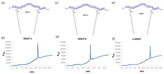 MSLPs molecules, characterized by a C18 alkyl hydrophobic moiety and a peptide core, corresponding to a MMP2- (MSLP-1, (a)) and a MMP2/9-responsive sequence (MSLP-2, (c)), and to a scrambled sequence (c-MSLP, (e)). HPLC chromatograms of the lipopeptides (purity > 90%) are provided respectively in (b,d,f).