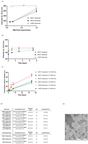 Characterization of MSLP-liposomes. (a) Hydrodynamic diameter of MSLP-liposomes prepared with different MSLP/Sm mass ratios, measured by DLS. (b) Hydrodynamic diameter of MSLP-liposomes measured by DLS at different time points. Dotted lines, 1:5 MSLP:Sm (mass/mass); continuous lines, 1:10 MSLP:Sm (mass/mass). (c) Cumulative calcein release from MSLP-liposomes. Inset: calcein release at short time points. Dotted lines, 1:5 MSLP:Sm (mass/mass); continuous lines, 1:10 MSLP:Sm (mass/mass). (d) Diameter, polydispersity index (PDI) and ζ-potential of MSLP-liposomes, empty or embedding calcein, measured by DLS and ZetaPALS device. (e) Representative TEM image of MSLP-liposomes (scale bar 200 nm). Results are expressed as mean ± SD (n = 10). *** p < 0.001 (Student’s t test).