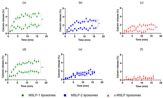 Calcein release from MSLP-liposomes in presence (top traces) or absence (bottom traces) of either activated MMP2 (a–c) or MMP9 (d–f). All data were subtracted of calcein release values from calcein-loaded chol/Sm/DSPE-PEG2000mal-liposomes. Results are expressed as mean ± SD. ** p < 0.01, *** p < 0.001 (Student’s t test). One-way ANOVA found a significant effect of treatment (MMP2 groups: F(5,96) = 29, p < 0.001; MMP9 groups: F(5,96) = 41, p < 0.001). Dotted lines/bottom, 1:5 MSLP:Sm, (mass/mass); continuous line/top, 1:10 MSLP:Sm, (mass/mass).