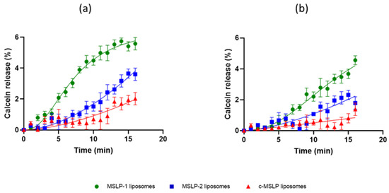 The release of calcein from MSLP liposomes (1:10 MSLP:Sm, mass/mass) functionalized with a mApoE sequence induced by the presence of activated MMP2 or MMP9 is shown in Figure 5. Once more, the highest release of calcein was detected for MSLP-1 liposomes, the lowest release resulted from c-MSLP liposomes, and a higher calcein release was obtained in presence of activated MMP2 (Figure 5a) in comparison with activated MMP9 (Figure 5b).