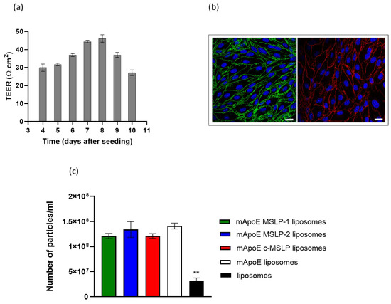 Characterization of a BBB in vitro model and evaluation of its permeability to MSLP-liposomes. (a) TEER values of the cell monolayer from day 4 to day 10 of its growth on a transwell. (b) Confocal microscopy visualization of junctions (blue, nuclei; green, claudin-5 and red, VE-cadherin). Bars represent 20 μm. (c) Evaluation of the permeability of mApoE-MSLP-liposomes across an endothelial monolayer after 3 h incubation by NanoSight. Results are expressed as mean ± SD (n = 3). ** p < 0.01 (Student’s t test).