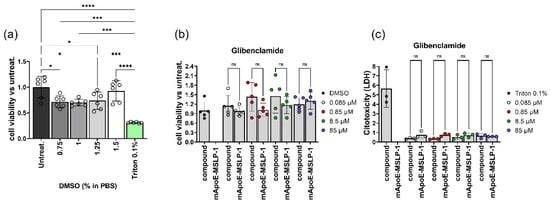 We tested cell toxicity elicited by mApoE-MSLP1-liposomes loaded with glibenclamide on primary neurons established from mouse E17.5 forebrains. We used mApoE- liposomes carrying the MSLP-1 core sequence, that provided the highest MMP-driven release of calcein and good glibenclamide loading in previous experiments. Upon plating, primary neurons were left to develop in vitro for 16 days and then treated with DMSO—i.e., the solvent used to dissolve glibenclamide—for 24 h. We observed a slight but significant reduction of cell viability of neurons exposed to DMSO (Figure 7a). We next incubated neurons either with glibenclamide-loaded mApoE-MSLP-1 liposomes, or with increasing concentrations of free glibenclamide, mirroring the concentration of the embedded drug payload in liposomes. Treatment for 24 h did not affect cell viability of neurons when compared with controls receiving DMSO (Figure 7b). Supernatants from these cultures, scored for LDH release, confirmed that both treatments did not increase cytotoxicity in primary neurons (Figure 7c).