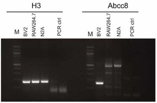 RT-PCR for H3 and Sur1/Abcc8. Five ng of cDNA were used in each PCR to amplify H3 (198 bps) and Abcc8 (166 bps) amplicons. Controls were obtained performing retro transcriptions on water, as well as including water in the PCR as an internal control. M: 100 bp ladder.