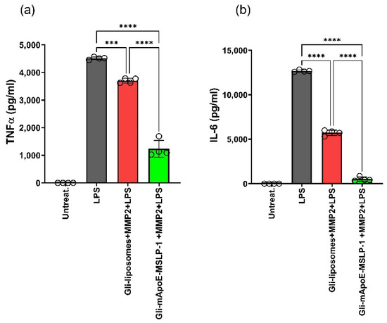 BV2 cells (80 k/well) were exposed to activated MMP2, MMP2-sensitive (green) and insensitive (red) glibenclamide (40 µM)-loaded mApoE liposomes for 40 h. Cells were then stimulated with LPS for 8 h before assaying TNF-α (a) and IL-6 levels (b) in supernatants. Levels of both cytokines were established by an ELISA assay; dots indicate individual experiments, and histograms show means ± SD; *** p < 0.001, **** p < 0.0001. One way ANOVA followed by Tukey’s multiple comparisons test.