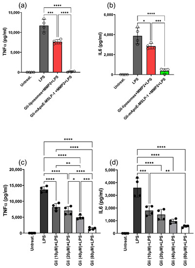 (a,b) BV2 cells (80 k/well) were exposed to activated MMP2, MMP-sensitive (green) and insensitive (red), glibenclamide (40 µm)-loaded mApoE liposomes for 60 h. Cells were then stimulated with LPS treatment for 8 h before assaying TNFα (a) and IL-6 (b) in supernatants; (c,d) BV2 cells (80 k/well) were exposed to increasing amounts of free glibenclamide (10–80µM) for 60 h before LPS stimulation for 8 h. The levels of both cytokines were established by an ELISA assay, dots indicate individual experiments, and histograms show means ± SD; * p < 0.05, ** p < 0.01, *** p < 0.001, **** p < 0.0001. One way ANOVA followed by Tukey’s multiple comparisons test.