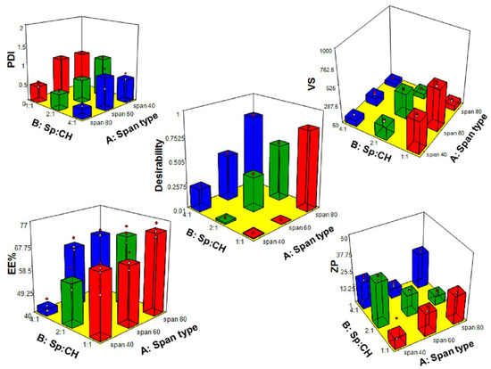 The choice of optimal formula was based on the desirability function. The optimization recommended obtaining formula with the least VS, least PDI, highest EE%, and highest ZP absolute value.