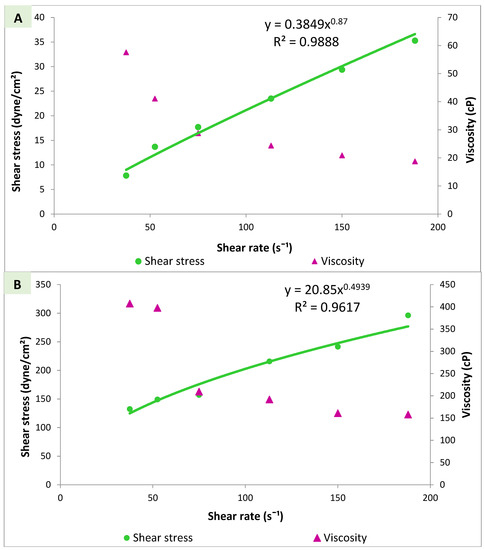 where τ is the shear stress (dyne/cm2), k is the consistency index (dyne/cm2 sn2) and γ is the shear rate (s−1) and 𝓃 is the index of flow.