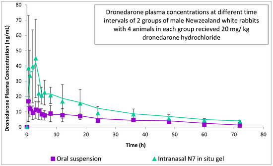 All the participating rabbits well tolerated the drug and the procedure implemented in the study. Every blood sample was obtained at the proper time. Plasma concentration—time data of dronedarone following oral administration of DRN suspension (treatment O) and intranasal administration of DRN niosomal in situ gel (treatment N) are shown in Figure 6. The pharmacokinetic parameters determined for the two treatments and the summary of these parameters are shown in Table 6.