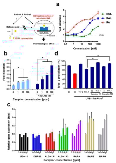 3.1. Camphor Enhances Retinol-Induced RAR Activation in Fibroblasts