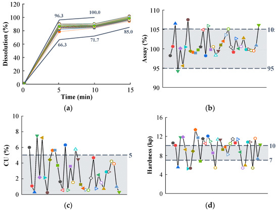 The effect of changes in the grade of MCC on the design space was confirmed using D13 (VIVAPUR® 200, JRS Pharma GmbH & Co. KG) and D15 (VIVAPUR® 301, JRS Pharma GmbH & Co. KG). Figure 6a,b presents the design space variability triggered by changes in the grade. Significant differences in the design spaces of D13 and D15 were noticed. In both D13 and D15, the design spaces were not observed, possibly because of the variability in the physicochemical properties triggered by a modification of the grade. As presented in Figure 2a,c, a negative correlation was identified between D13 and D15 in PC2, and PC2 was predominantly affected by LOD, SI, HR, CI, tapped density, and PSD (D10, D50, and D90). D15, which had a positive score in PC2, exhibited high LOD and SI and low HR, CI, tapped density, and PSD (Table 2). In contrast, D13, which had a negative score in PC2, exhibited low LOD and SI and high HR, CI, tapped density, and PSD (Table 2). The variations in physicochemical properties could trigger the variability of CQAs that leads to design space variability. As presented in Figure 5 and Table S7, LOD exhibited a negative correlation with dissolution, whereas PSD had negative correlations with dissolution and friability and a positive correlation with hardness. Moreover, HR and CI exhibited positive correlations with dissolution. Dissolution at 5, 10, and 15 min of D13 was 9.61–100.22%, 34.14–101.15%, and 38.69–103.47%, respectively, and that of D15 was 10.04–104.68%, 35.65–105.65%, and 40.41–108.07%, respectively. Despite the fact that LOD, HR, and CI showed a correlation with dissolution, dissolution was primarily affected by PSD. PSD exhibited a robust negative correlation with dissolution and D13, which displayed high PSD and had slower dissolution profiles than D15. The friabilities of D13 and D15 were 0.03–0.84% and 0.10–2.97%, respectively. PSD had a negative correlation with friability and because D15 had lower PSD than D13, it exhibited high friability. The hardness values of D13 and D15 ranged from 9.31 kp to 11.93 kp and between 4.62 kp and 5.92 kp, respectively. Based on the data in Figure 5 and Table S7, a strong positive correlation between PSD (D10, D50, and D90) and hardness was observed. Consequently, D13, which displayed high PSD, exhibited greater hardness than D15. Of note, there was no significant correlation between tapped density and CQAs, whereas SI had a negative correlation with the assay and a positive correlation with CU. The assay and CU of D13 ranged from 97.71% to 105.13% and between 0.04% and 1.11%, respectively, whereas those of D15 were between 95.24% and 101.44% and 0.30% and 8.35%, respectively. As previously mentioned, SI exhibited a positive correlation with CU and a negative correlation with the assay. D13, which had low SI, exhibited a higher assay and lower CU than D15.
