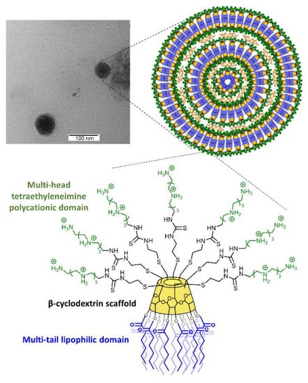 However, these drugs are limited both in terms of their stability and off-target immunogenicity, being difficult to adjust given their multicomponent character and the intrinsic polydisperse nature of some LPN constituents [10,11]. Hence, molecularly defined vectors that are effective in monoformulation formats have emerged as an attractive alternative to LNPs to help researchers realize the full potential of non-viral gene therapy [12,13]. In this sense, cyclic oligosaccharide platforms have proven particularly useful in the production of specifically customized carriers that can then be optimized by precision chemistry strategies that enable configurational and conformational modifications [14,15,16]. Of note, previous work has shown that multi-head/multi-tail Janus-type polycationic amphiphilic β-cyclodextrin (βCD) derivatives can be tailored to undergo coordinated self-assembly alongside genetic material to produce βCD/nucleic acid nanocomplexes (CDplexes) [17,18,19].