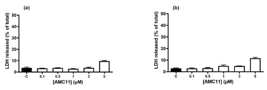 AMC11 toxicity on human prostate cancer cell lines. (a) LNCaP and (b) PC3 prostate cancer cells were exposed to increasing AMC11 concentrations ranging from 0.1 to 5 µM for 72 h. Then, the percentage of LDH release was determined as an index of cell death. Data represent mean ± SEM of 8 to 12 determinations.
