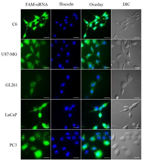 FAM-siRNA cellular uptake in C6, U87, GL261, LNCaP, and PC3 cell lines. AMC11 is capable of efficiently delivering FAM-siRNA into glioblastoma and PC cell lines after 6 or 8 h of incubation. The figure shows representative images of FAM-siRNA, Hoechst 33343 staining the nuclei, overlay of FAM-siRNA, and differential interference contrast microscopy (DIC) image. Scale bar: 25 µm.