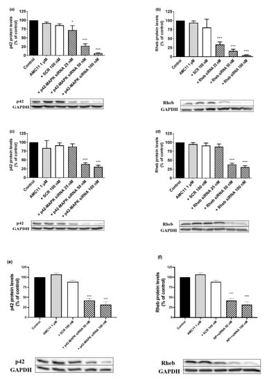 Transfection efficiency of AMC11 in LNCaP, PC3, and astrocytes. (a) p42-MAPK protein levels in LNCaP cells, (b) Rheb protein levels in LNCaP cells, (c) p42-MAPK protein levels in PC3 cells, (d) Rheb protein levels in PC3 cells, (e) p42-MAPK protein levels in rat astrocytes, and (f) Rheb protein levels in rat astrocytes. Cells were exposed for 72 h to the indicated treatments and the specific protein levels determined as indicated in Materials and Methods. Western blot bands show representative experiments for each experimental condition. Data represent mean ± SEM of 5 to 8 experiments: * p < 0.05, *** p < 0.001 as compared to control values.