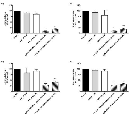 Simultaneous knockdown of p42-MAPK and Rheb in LNCaP and PC3 cell lines. (a) p42-MAPK protein levels in LNCaP cells, (b) Rheb protein levels in LNCaP cells, (c) p42-MAPK protein levels in PC3 cells, and (d) Rheb protein levels in PC3 cells. Cells were exposed for 72 h to the indicated treatments and the specific protein levels determined as indicated in Materials and Methods. Data represent mean ± SEM of 4 to 6 experiments *** p < 0.001 as compared to control values.