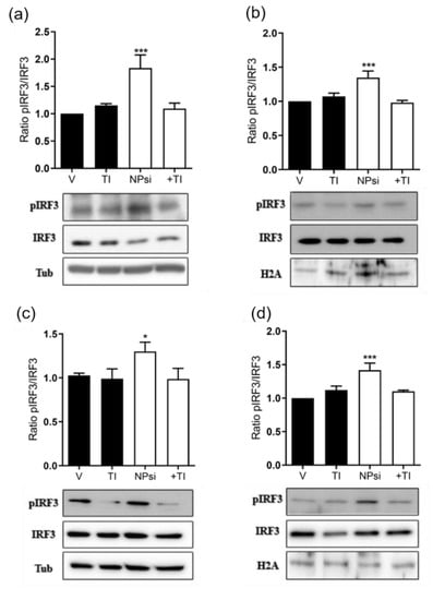 Activation of the TLR3-IRF3 pathway in response to SCR-siRNA administration in LNCaP (a,b) and PC3 (c,d) cells. Effect of the TLR3 inhibitor (R)-2-(3-chloro-6-fluorobenzo[b]thiophene-2-carboxamido)-3-phenylpropanoic acid (TI; 10 µM) on phosphorylation of IRF3 (pIRF3) induced by treatment of LnCaP and PC3 cells with nanocomplexes formulated from AMC11 (1 µM) + SCR-siRNA (100 nM) (Npsi) in both cytosolic (a,c) and nuclear (b,d) cellular fractions. Data are expressed as mean ± SEM from 6 to 12 determinations from at least 3 independent experiments. * p < 0.05, *** p < 0.001 compared with vehicle-treated cells (V).