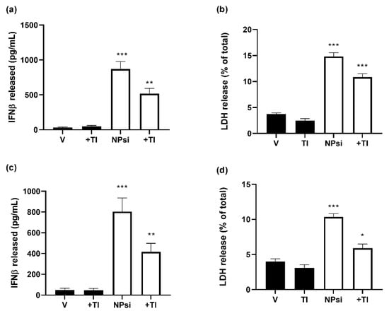SCR-siRNA-induced production of IFNβ and cell death in LNCaP (a,b) and PC3 (c,d). Cells were treated with nanocomplexes formed by AMC11(1 µM) and SCR-siRNA (NPsi, 100 nM) for 72 h, and IFNβ production (a,c) and cell death (b,d) were determined in presence and absence of a TLR3 inhibitor (TI, 10 µM). Data are expressed as mean ± SEM from 6 to 12 experiments. * p < 0.05; ** p < 0.01; *** p < 0.001 compared with control-treated cells.