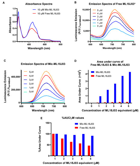Absorption spectra of the free ML18J03 (1% DMSO in PBS) and Mic-ML18J03 (in PBS) were measured using a Thermo Evolution 350 Spectrophotometer between 200 nm and 800 nm. Luminescence emission spectra of the free ML18J03 (1% DMSO in PBS) and Mic-ML18J03 (in PBS) were measured using a Horiba (Kyoto, Japan) Fluorlog Fluorometer from 600 nm to 800 nm using excitation at 448 nm.
