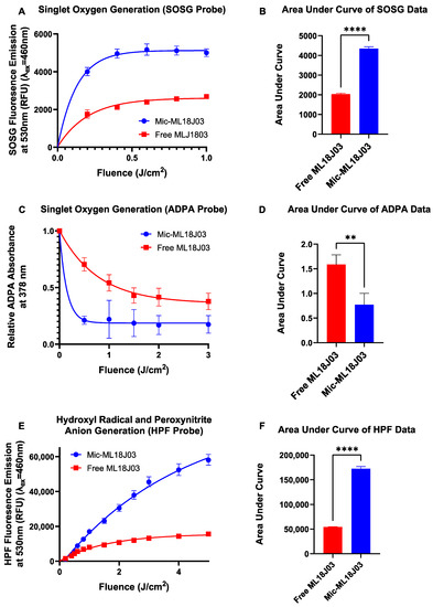(A,B) Production of singlet oxygen by free ML18J03 and Mic-ML18J03 measured using the fluorescent probe Singlet Oxygen Sensor Green (SOSG; λExc = 460 nm, λEmi = 530 nm). (C,D) Singlet oxygen generation by free ML18J03 and Mic-ML18J03 measured using the colorimetric probe anthracene dipropionic acid (ADPA) at 378 nm absorbance. (E,F) Hydroxyl radical and peroxynitrite generation by free ML18J03 and Mic-ML18J03 measured using the fluorescent probe hydroxyphenyl fluorescein (HPF). (All of the data is presented as mean ± standard error; statistical significance was calculated using a two-tailed t-test, **: p ≤ 0.01, ****: p ≤ 0.0001).