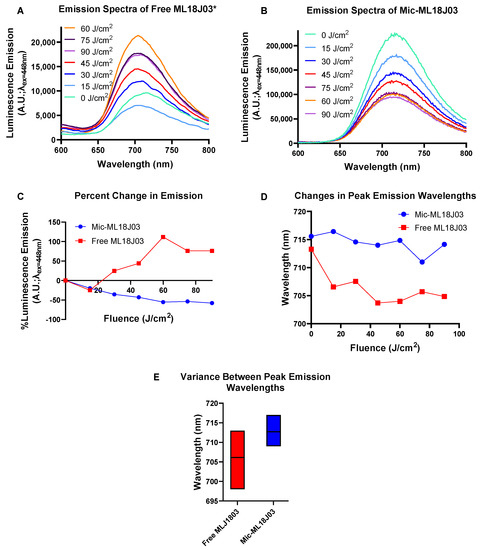 Raw luminescence emission spectra of free ML18J03 in 1% DMSO and PBS (A) and Mic-ML18J03 in PBS (B; λExc = 448 nm, λEmi = 600–800 nm) upon photoirradiation using 420 nm light at an irradiance of 46.08 mW/cm2. (C) Relative changes in the peak luminescence emission values upon photoirradiation. (D) Shifts in the wavelengths of emission maxima of free ML18J03 and Mic-ML18J03 upon photoirradiation. (E) Min-max plot depicting the variations in peak luminescence emission wavelength for both free ML18J03 (variance = 27.26) and Mic-ML18J03 (variance = 6.48) during photoirradiation from 0–90 J/cm2. (Smoothing curve analysis applied with a factor of 10 to (A)).