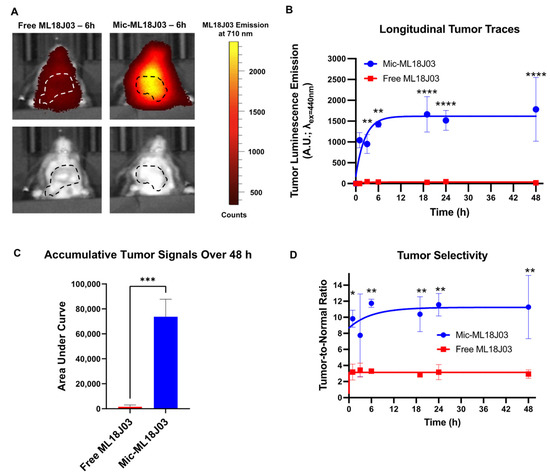 (A) Representative images of orthotopic in vivo AT-84 tumors in C3H/HeJ mice 6 h following intravenous administration of free ML18J03 or Mic-ML18J03 (30 mg/kg); (λExc = 440 nm, λEmi = 710 nm). Quantification of the longitudinal (B) and accumulative (C) in vivo luminescence emission signals of free ML18J03 or Mic-ML18J03 up to 48 h following administration. (D) Tumor selectivity of free ML18J03 or Mic-ML18J03 with respect to nearby healthy tissue. (All luminescence emission signals have been corrected for tissue autofluorescence for each respective animal. All of the data is mean ± standard deviation; statistical significance was calculated using a One-Way ANOVA test (A,D) and a two-tailed t-test (D). *: p ≤ 0.05, **: p ≤ 0.001, ***: p ≤ 0.001, ****: p ≤ 0.0001).