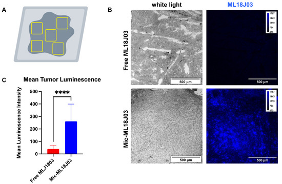 (A) Diagrammatic representation of the randomly sampled regions of interest (ROIs) across the entire tumor cross-section for mice administered with either Mic-ML18J03 or Free ML18J03. Representative white light and luminescence images (B; false color blue) and quantitative analysis (C) of tumor sections obtained from bisected AT-84 tumors 48 h following intravenous administration of free ML18J03 or Mic-ML18J03. (Images were processed using ImageJ; scale bar and calibration bar are represented) (All of the data is mean ± standard deviation; n = 3 (5 ROIs per tumor); statistical significance was calculated using a non-parametric two-tailed t-test, ****: p ≤ 0.0001).
