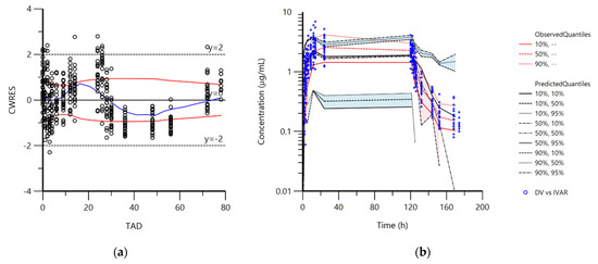 (a): Plot of conditional weighted residual values (CWRES) versus time after dose (TAD, h); <20% of values (3.46%) were outside the accepted limits y = 2 and y = −2, demonstrating adequate description of changes in concentrations by the pharmacokinetic model. (b): Visual predictive check (VPC) plot depicting the observed quantiles (10, 50, and 90%) and corresponding predicted quantiles for doxycycline concentrations.