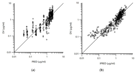 (a): Logarithmic plot of the dependent variable (DV, measured plasma concentrations in µg × mL−1) versus predicted plasma concentrations (PRED, µg × mL−1) of doxycycline in all treated chickens (n = 32). (b): Logarithmic plot of the dependent variable (DV, measured plasma concentrations in µg × mL−1) versus individual predicted doxycycline concentrations (IPRED, µg × mL−1) of doxycycline in all treated chickens (n = 32).