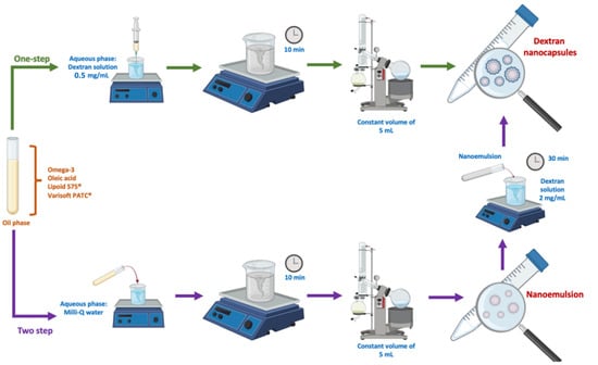 Nanosystems were designed using the solvent-displacement method []. The first nanosystem elaborated was a nanoemulsion (NE), with an oil phase that consisted of ω-3, oleic acid, lipoid S75®, and Varisoft PATC® dissolved in 750 μL of ethanol and 4.25 mL of acetone and an aqueous phase consisting of 10 mL of Milli-Q water. Once the oil phase was prepared, this was directly added to the aqueous phase and mixed by magnetic stirring for 10 min. Finally, the organic solvents were eliminated by evaporation (Rotavapor Heidolph, Germany) to a constant volume of 5 mL. For the preparation of the dextran nanocapsules (DX NC) in a two-step methodology, 2 mL of the isolated NE was incubated with 2 mL of dextran sulfate solution (2 mg/mL) for 30 min.