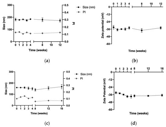 Stability of the dextran nanocapsules (DX NC*) with or without imiquimod in their core at 4 °C. Conditions: 4 °C. (a) Size and polydispersity index of DX NC*. (b) Zeta potential of DX NC*. (c) Size and polydispersity index of DX NC-imq*. (d) Zeta potential of DX NC-imq*. Imq: imiquimod. PI: polydispersity index. * Formulation elaborated applying high manual pressure. (Mean ± SD, n = 3).