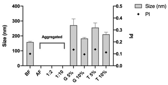 To produce a freeze-dried product, DX NC-imq* were diluted with different proportions of Milli-Q water or cryoprotectants and then freeze-dried for 24 h (Section 2.6). As can be seen in Figure 6, DX NC-imq* freeze-dried and diluted at different concentrations of Milli-Q were aggregated, which makes nanosystems incapable of maintaining their physicochemical characterization, probably due to the stress to which the samples were subjected. This occurred especially in the process of freezing the nanosystems, where the formation of water crystals gives the result of a saturated solution of the remaining components, which increases the possibility of aggregation []. This result indicated that cryoprotectants are necessary to keep the size and polydispersity index of DX NC [].